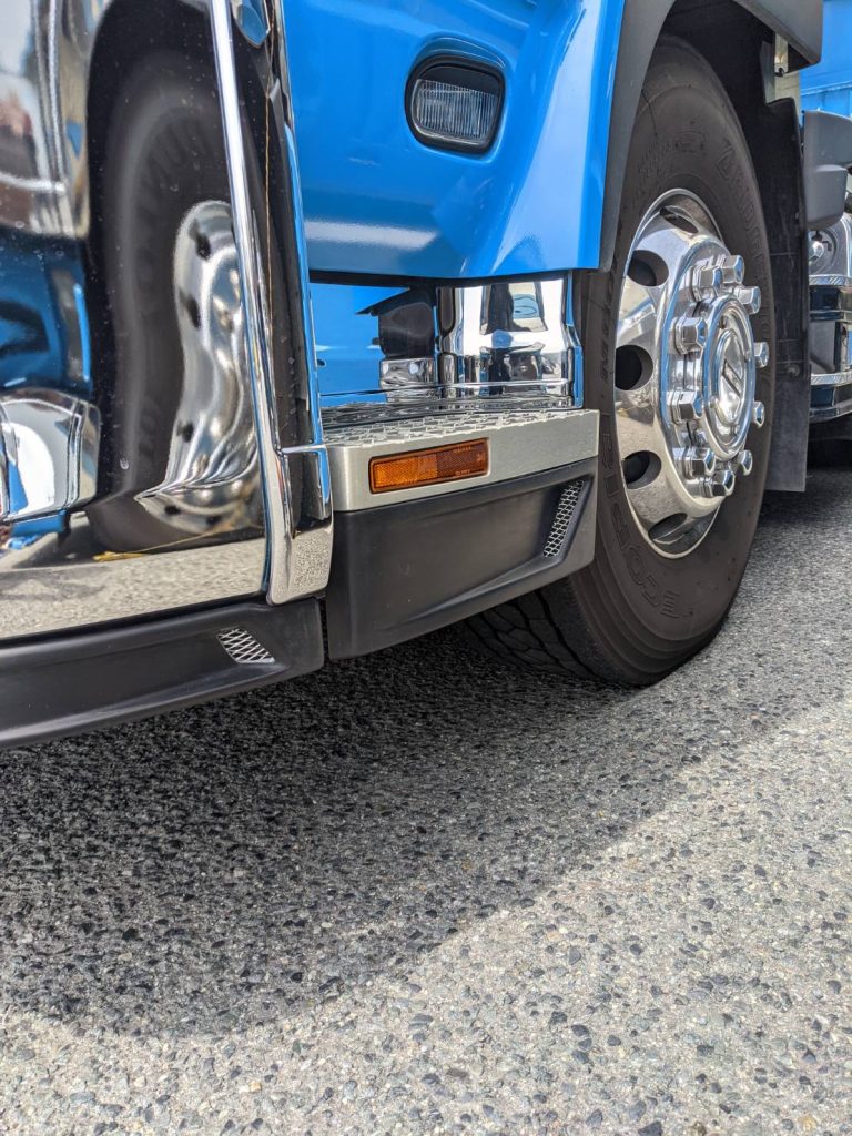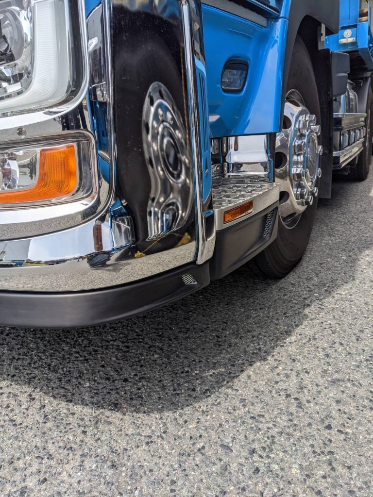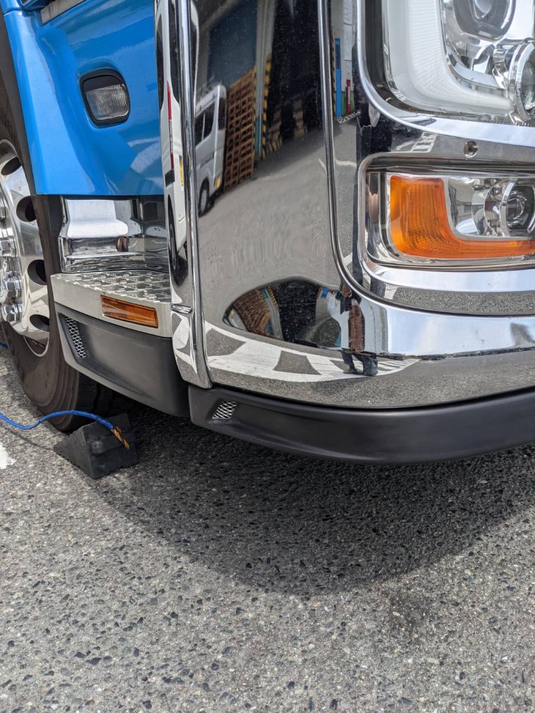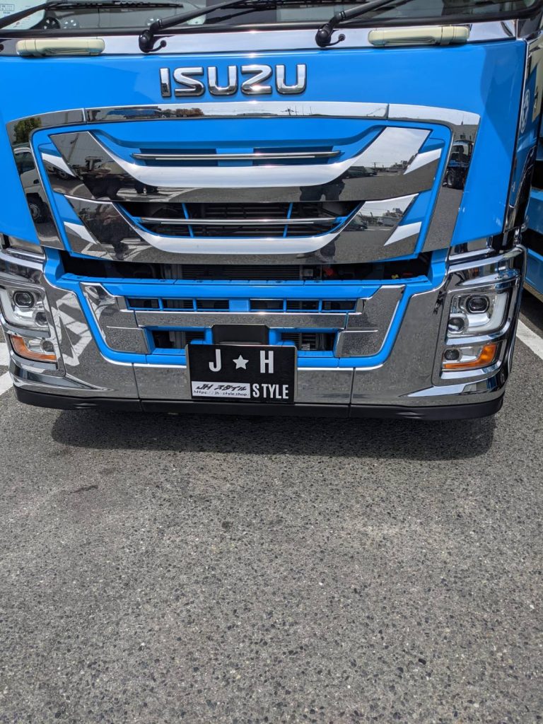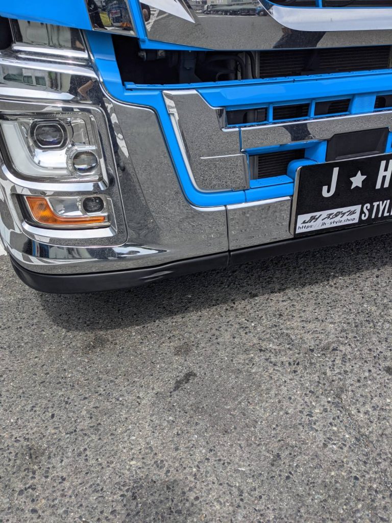 JHスタイル製 いすゞNewギガ(ギオン)フロントスポイラー スタイル1です。(素材はFRPになります) スポイラー3P,ステップ下2P 合計5Pになります。 スポイラーは純正バンパー底部のステーの穴にM8ボルトとM6ボルト、ナットで締めだけです。(ボルト、ナットはサービスとして付属しておりますが、欠品等はお客様でご購入ご対応お願い致します)ステップ下は純正パーツを取り外し、純正ボルト、クリップナットを流用し、交換して下さい。 トラックエアロとしては今までにない、スポーツスタイルを意識した製品になります。 純正バンパーより前方へ約20ミリ、高さが両サイド約85ミリの幅で抑えております。